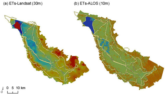 Comparison of ETs-Landsat (a) against ETs-ALOS (b).