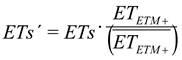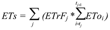 In recent literature [38,39] a method for temporal integration was suggested, in which the fraction ETrFj = ETaj/EToj (where j refers to the satellite image acquisition date and EToj to the potential evapotranspiration for day j) was considered constant for the time period between two consecutive satellite images, and the seasonal ETa (termed ETs) could be simulated with the following equation: