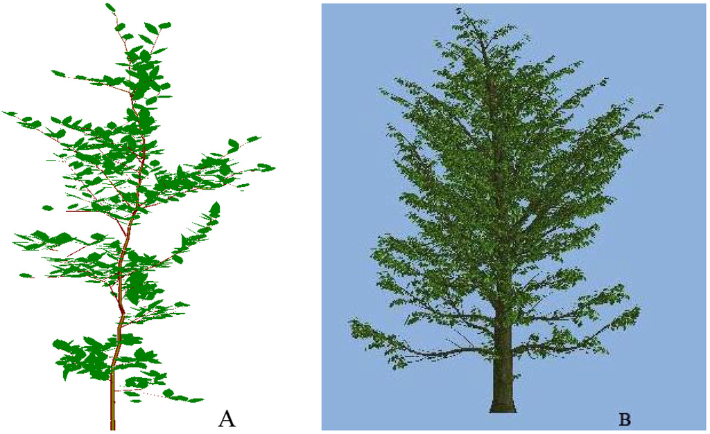 Trees used for explicit simulation of the Fagus sylvatica (L.) canopy. Left (A), a 9 year old in situ measured tree; right (B) a 15 year old AMAP simulated tree.