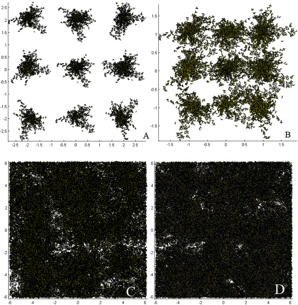 Simulated Fagus sylvatica (L.) stand comprised of 9 trees. Four LAI scenarios are presented. Upper stands (9 years old Fagus) are derived from in situ measured trees; (A) with the observed plantation distance of 1.8 m × 2.0 m (LAI = 0.58), and (B) with a changed plantation distance of 1.0 m × 1.0 m (LAI = 1.29). Bottom stands (15 years old Fagus) are derived from AMAP library and have an LAI of 2.76 (C) and 3.65 (D) respectively. The axes of the figures indicate the stand dimensions in meters.