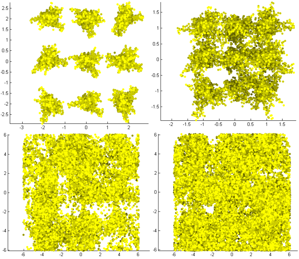 PBRT generated APAR per leaf for all 3D simulated stands. The four figures present the nadir view of the stands with LAI 0.58, 1.29, 2.76, and 3.65, respectively. The leaves are separated in percentage classes of absorbed light ranging from yellow (80%–100% absorbed light) to black (0%–5% absorbed light). Sun is at 10° from nadir. The axes of the figures indicate the stand dimensions in meters.