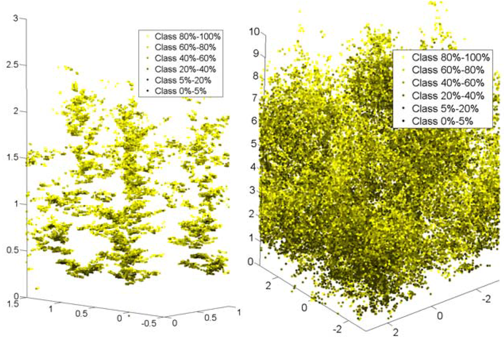 The two figures present the side view for the stands of LAI of 1.29, and 2.76 left and right respectively. The leaves are separated in percentage classes of absorbed light ranging from yellow (80%–100% absorbed light) to black (0%–5% absorbed light). Sun is at 10° from nadir. The axes of the figures indicate the stand dimensions in meters.
