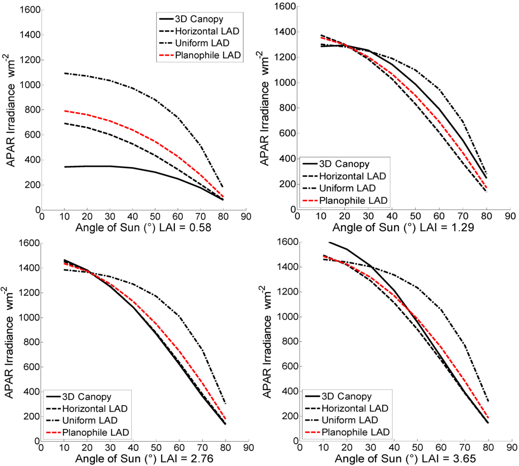 Diurnal sun angular variation of canopy APAR (w m−2). The four different graphs show absorbed irradiance from all canopy representations and LAIs.