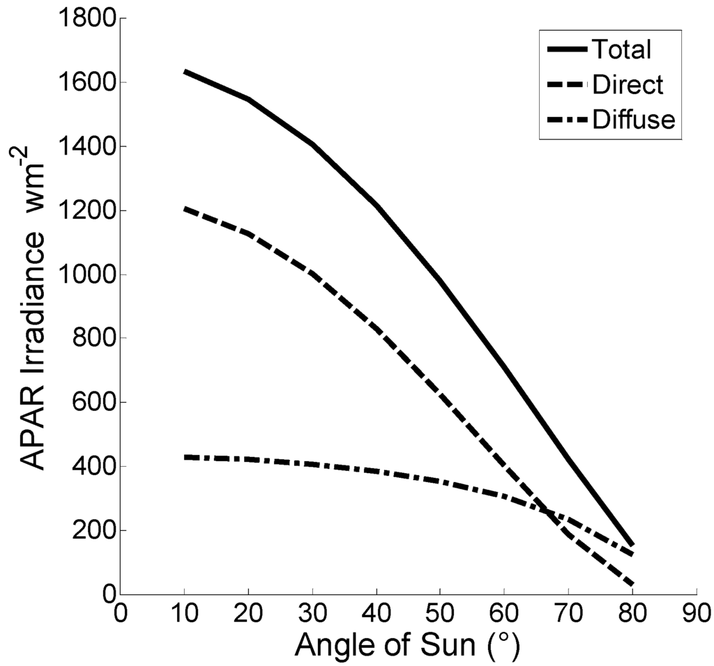 Diurnal variation of Absorbed Photosynthetically Active Radiation irradiance (APAR) (w m−2). Data were collected for a single day during June 2004 depicting direct, diffuse, and total irradiance for a partly cloudy sky.