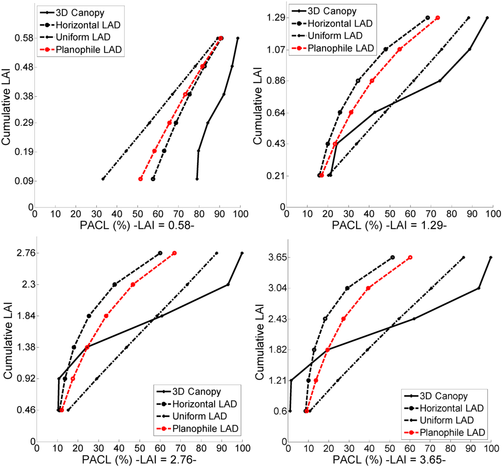 A detailed analysis of the leaf distribution and its effect on APAR was performed in order to further investigate the APAR results obtained by the multilayer representations and the geometrically explicit canopies. Canopies were stratified in increments of LAI (increments of 1/6) and the number of leaves per LAI increment was calculated together with the PACL per cumulative LAI (Figure 7). This analysis was performed to compare the differences in leaf quantity, position, and irradiance absorption inside a 3D canopy to a multilayer representation.