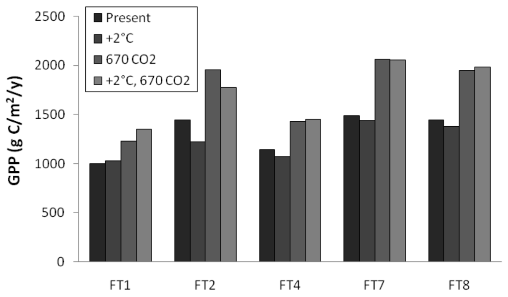 In general, the application of the simulation methodology produces plausible results for all forest types considered. The simulated climate scenarios reduce ecosystem production in all cases except for FT 1 (white fir / Norway spruce forests). This increase is in accordance with other works on the same subject which demonstrate that GPP is strictly dependent on mean annual temperature in temperate-humid climates [40]. In contrast, a decrease in productivity similar to that currently observed can be expected for forest ecosystems placed in warmer and drier areas, since in these conditions plants limit photosynthetic activity in order to reduce water loss by transpiration [1,41].