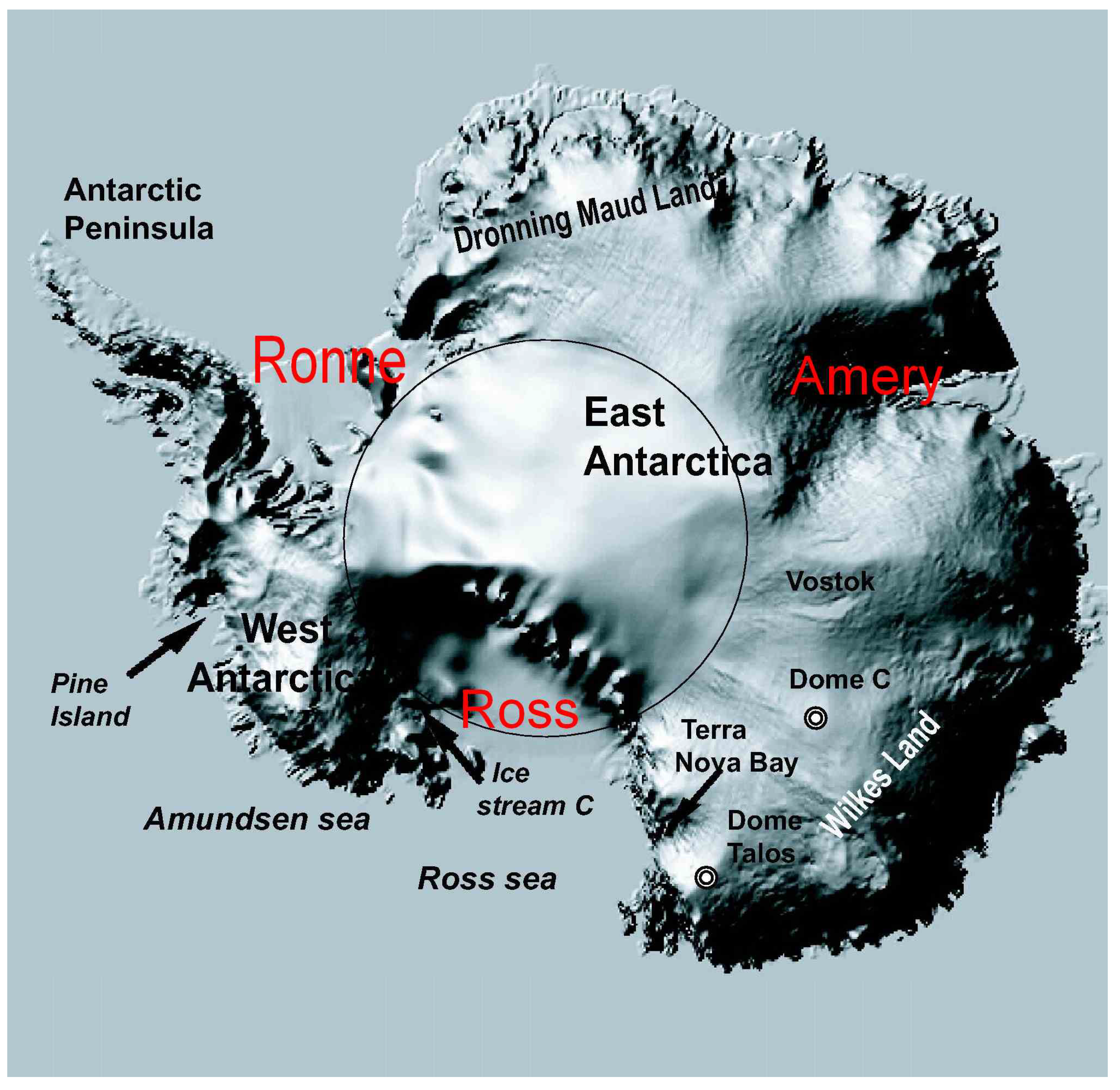 Map of the Antarctic ice sheet with the main places cited in the text. Ice shelf names are in red.
