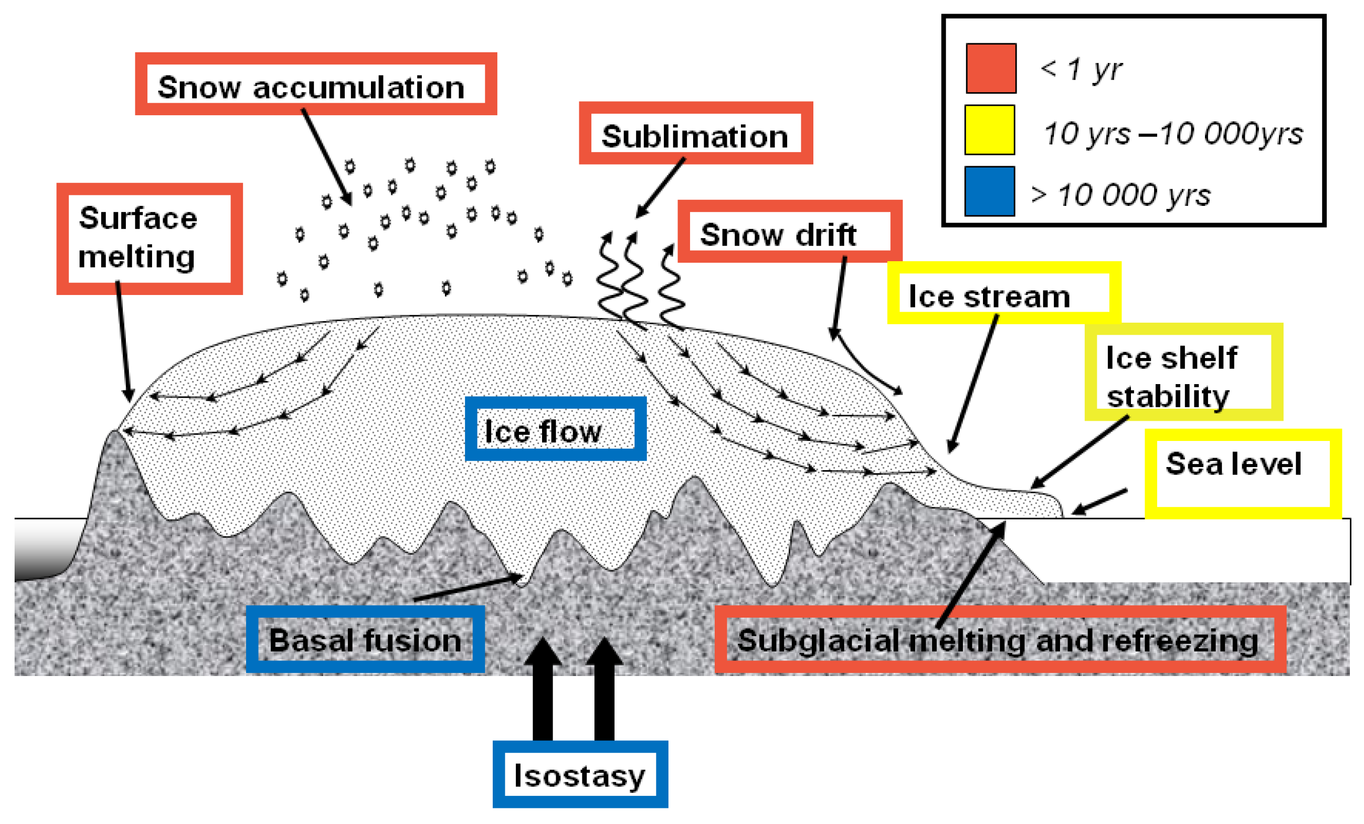 Ice sheet mechanisms and time-scale outline adapted from [7]. Surface melting, snow precipitation, sublimation, wind-driven sublimation and basal melting or refreezing are assumed to instantaneously react to climate change. Ice streams, outlet glaciers are assumed to react quickly (between 1 yr to 10 yr) or slowly as ice-shelf dynamics to climate change (meaning between 100 and 1,000 yr). On the contrary, ice flow, basal temperature and fusion isostasy take a very long time to react (time lag is between 10,000 and 100,000 years).