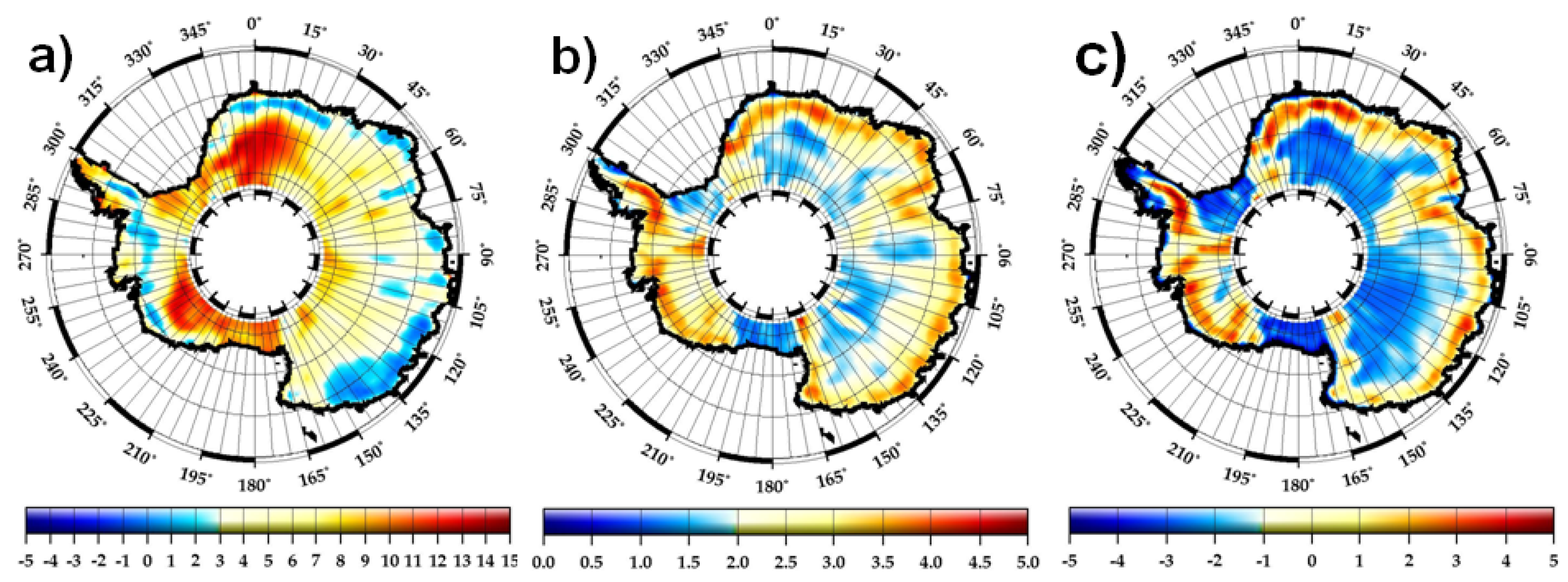 Mean altimetric waveform parameters mapped over Antarctica in Ku-band from 2003 to 2007. (a) The backscattering coefficient expressed in dB, (b) the leading edge width expressed in meters, (c) the trailing edge slope expressed in 106 s−1.