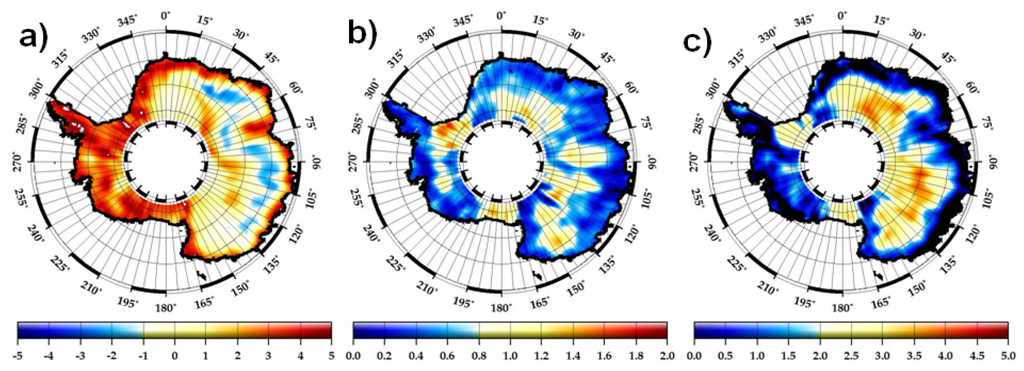 Balance velocity (Figure 9) is lower than 1 m/yr near the dome and reaches 100 m/yr near the coast [85,86]. It is clear that ice flow divergence and convergence are controlled by the surface topography that plays a significant role in ice flow. One can observe fast flowlines or ice streams, with tributaries networks, whose effects are felt until several hundred of kilometres inside the continent. Indeed, 80% of the continent is found to be drained by only 20% of the coast. It is probably one of the major discoveries provided by altimetry for Antarctica. Indeed, this irregular flow distribution/ice flow network gets important consequences concerning ice sheet behaviour regarding to climate change. A fast glacier will respond more quickly to perturbations than a slower one. Also, a perturbation at the coast, for instance a change in the velocity of an outlet glacier, will propagate all along the stream. It then highlights the most sensitive areas of the ice sheet.
