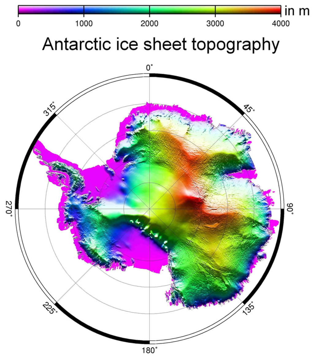 High-resolution map of the Antarctic Ice Sheet topography from the ERS-1 geodetic mission [7]. The elevation reaches 4000 m. Note the numerous details: ice shelves surrounding most of the continent, surface undulations, flat areas reflecting subglacial lakes, elongated scars due to hydrological networks.