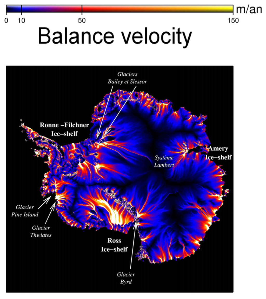 Map of the balance velocity expressed in m/yr from [15]. Note the presence of numerous ice streams that can be followed far away in the upslope direction. The name and location of the main outlet glaciers are shown.