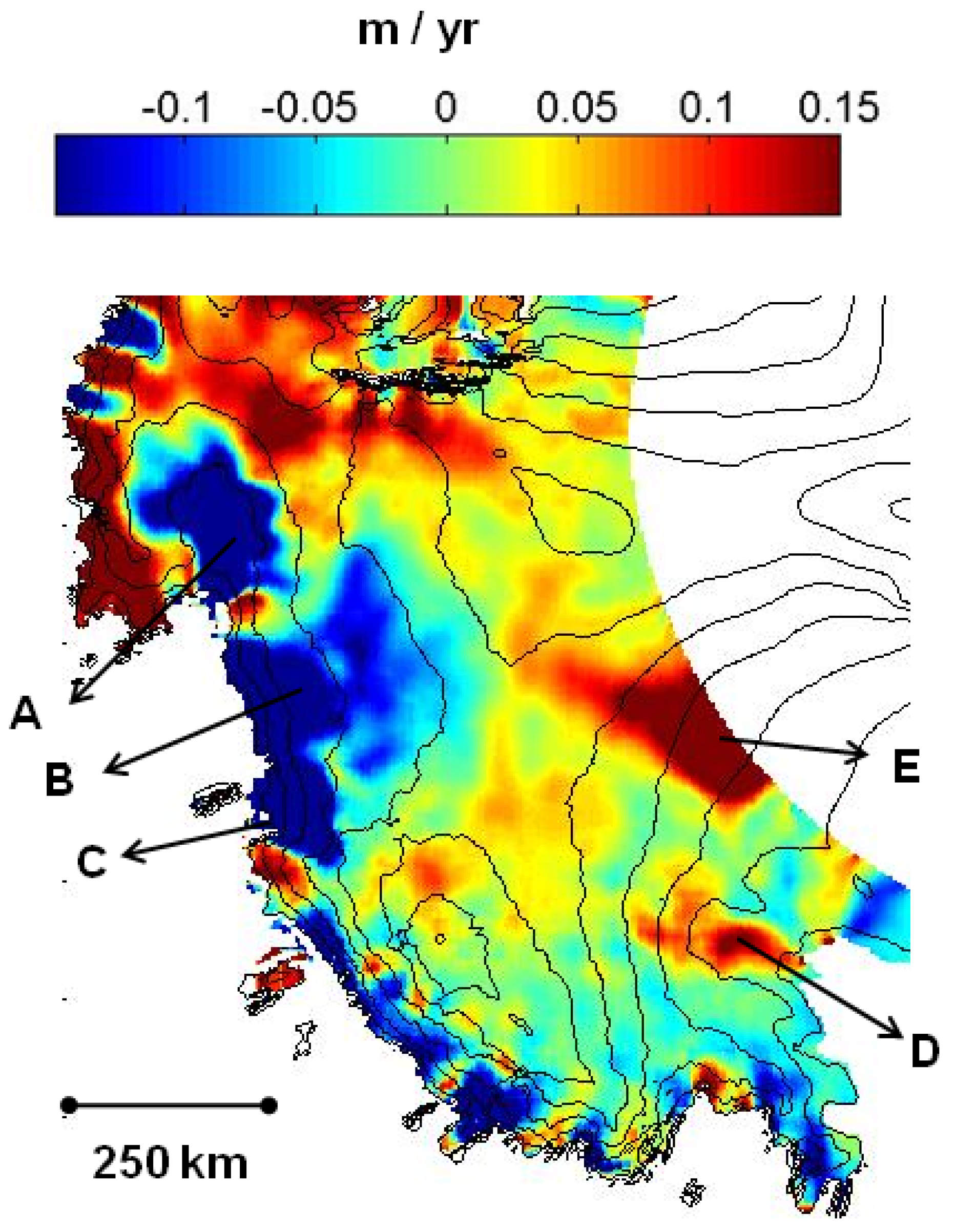 Another surprising finding was the detection of rapid change in the volume of several outlet glaciers. The most famous ones are the space and time evolutions of the glaciers belonging to the Amundsen Sea drainage systems (Pine Island, Thwaites and Smith Glaciers). With the help of radar altimetry and interferometry, Shepherd et al. [106,107] showed that the rapid thinning of ice was detected up to 150 km inland. The three mentioned glaciers thinned by more than 1.6, 2.5 and 4.5 m at the ground line location between 1992 and 1999, respectively, and while the Thwaites and Smith glaciers increased by 25 and 45 m between 1991 and 2001, respectively. The signature of this thinning suggested a dynamical answer of the ice initially due to ocean thermal forcing. Indeed, the thinning rate decreases with distance to the coast. An outlet perturbation is then clearly propagating in the upslope direction. The imbalance of this sector is sufficient to raise sea level by more the 0.2 mm/yr [108]. The latest studies on the Pine Island glacier confirm the inland thinning and its relation with internal dynamical processes [109]. The grounding line retreat toward the interior is such that the main part of the glacier might be afloat within the next century [110]. However, in the same sector, some glaciers are also found to be thickening, as shown on Figure 9.