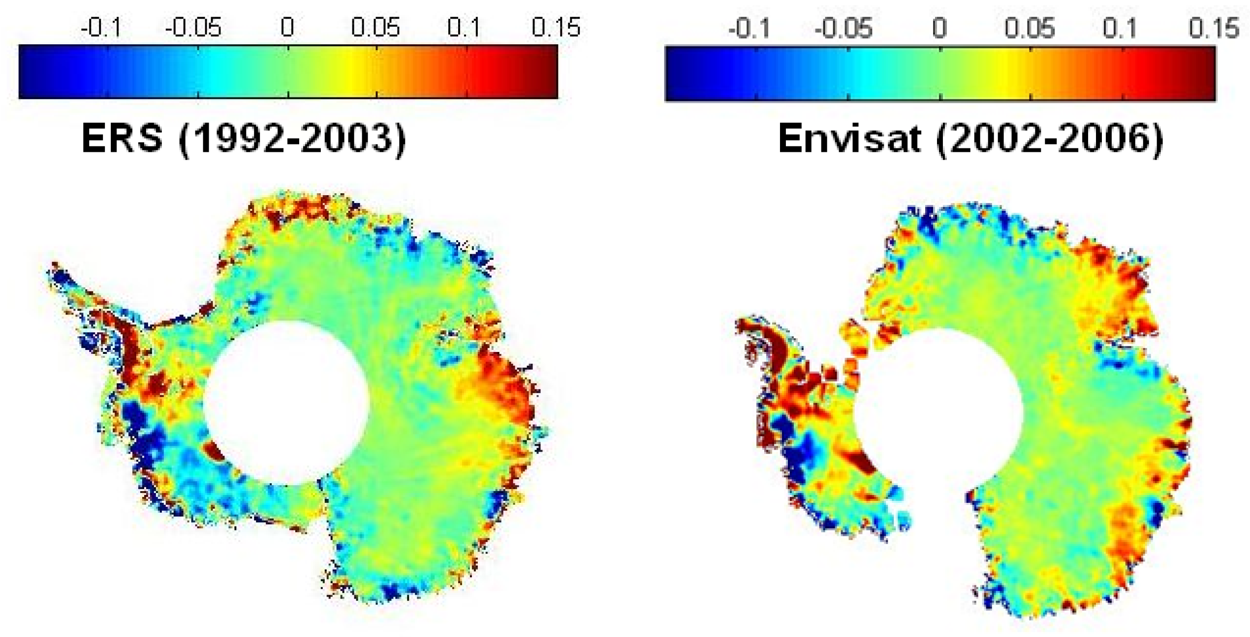 Several attempts to derive ice sheet mass balance with the help of the altimetric time series of ERS-1, ERS-2 and Envisat have been published [98,99,100,101]. The whole details of the data processing can be found in each of these papers. In order to derive height variation trends, most of the methodology focuses on the difference at cross-over points in order to minimize long-scale errors and the error due to the antenna polarization [102]. Only one study [100] uses repeat tracks, leading to larger data sets with a finer resolution.