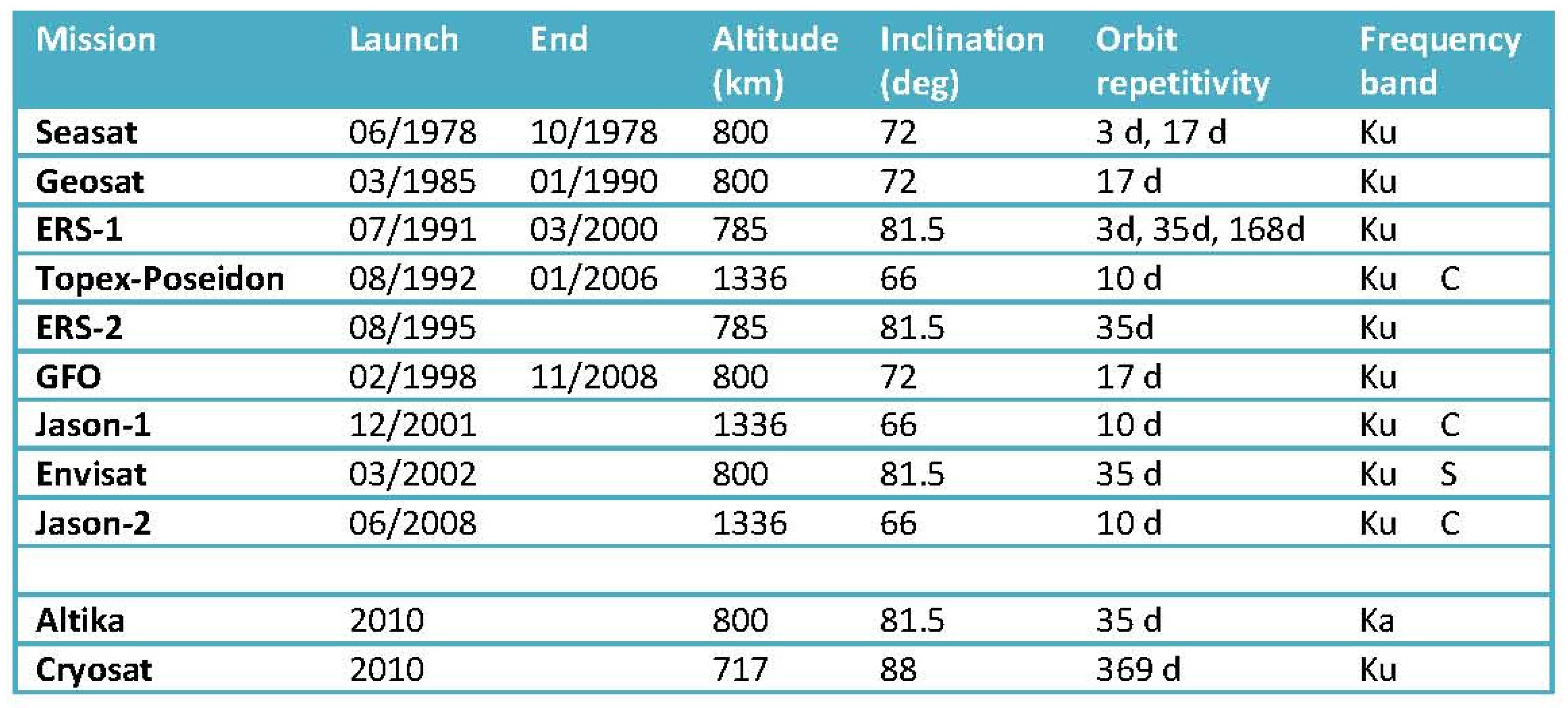 Altimetric missions with altitude, inclination, repetitivity and wavelength band (Ku, 13.6 GHz; C, 5.6 GHz; S, 3.2 GHz; Ka, 37 GHz) with respect to launch. Two future missions planned to be launched in 2010 are also indicated.