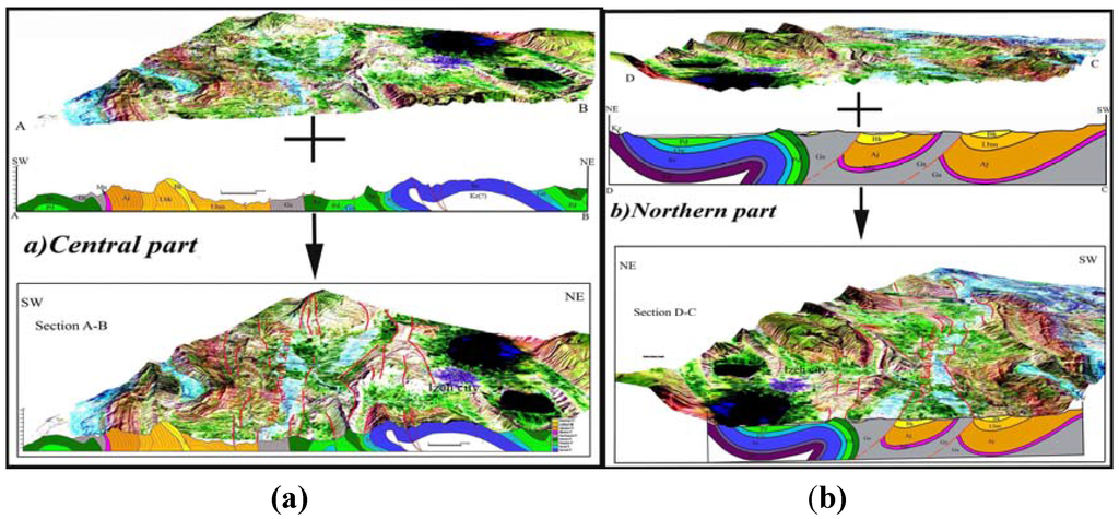 The geometrically corrected and filtered pseudocolor image was overlaid on the DEM of the study area. The combinations of the DEM and overlay images were plotted along the cross sections. Then the cross sections were laterally attached on the DEM and finally the 3D sketches were prepared perpendicular to the Izeh fault zone which is part of the study area (consisting of the Dezful Embayment, Izeh Fault and Izeh Zone, Figure 5). These 3D sketches present the 3D visualization and perspectives of surface-subsurface relationship of faulting along the Izeh Fault Zone and consequently structural style of study area. It uses for determining the Izeh Fault Zone position and its movement trace (mechanism of faulting).