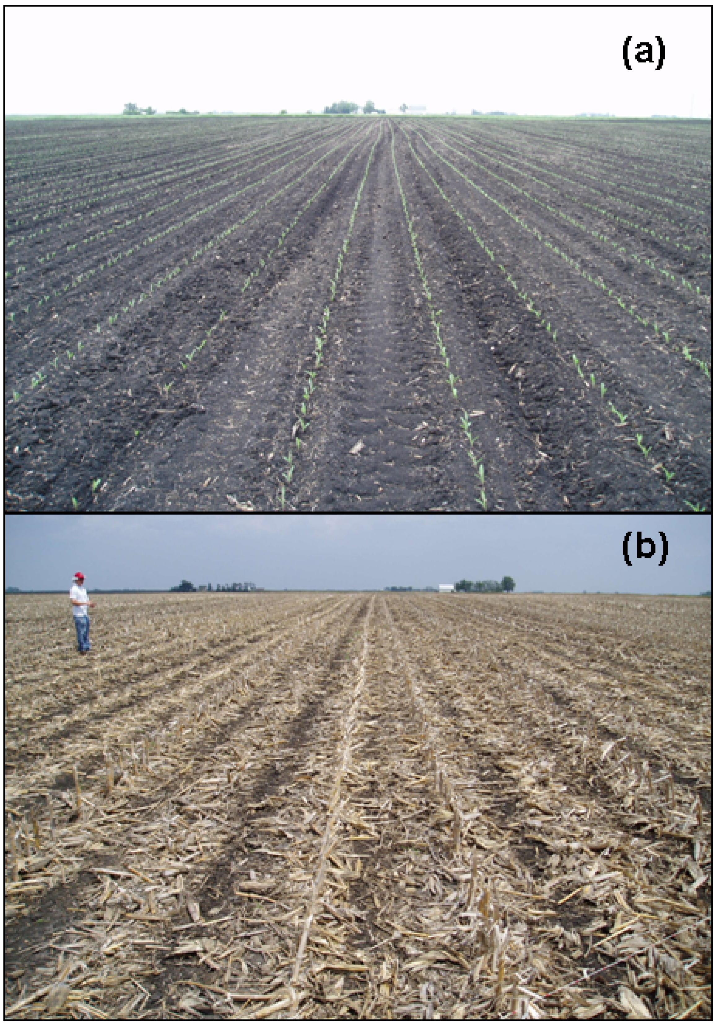 Photographs of (a) conventional (intensive) and (b) conservation (no-till) tillage from the area surrounding Ames, Iowa, USA.