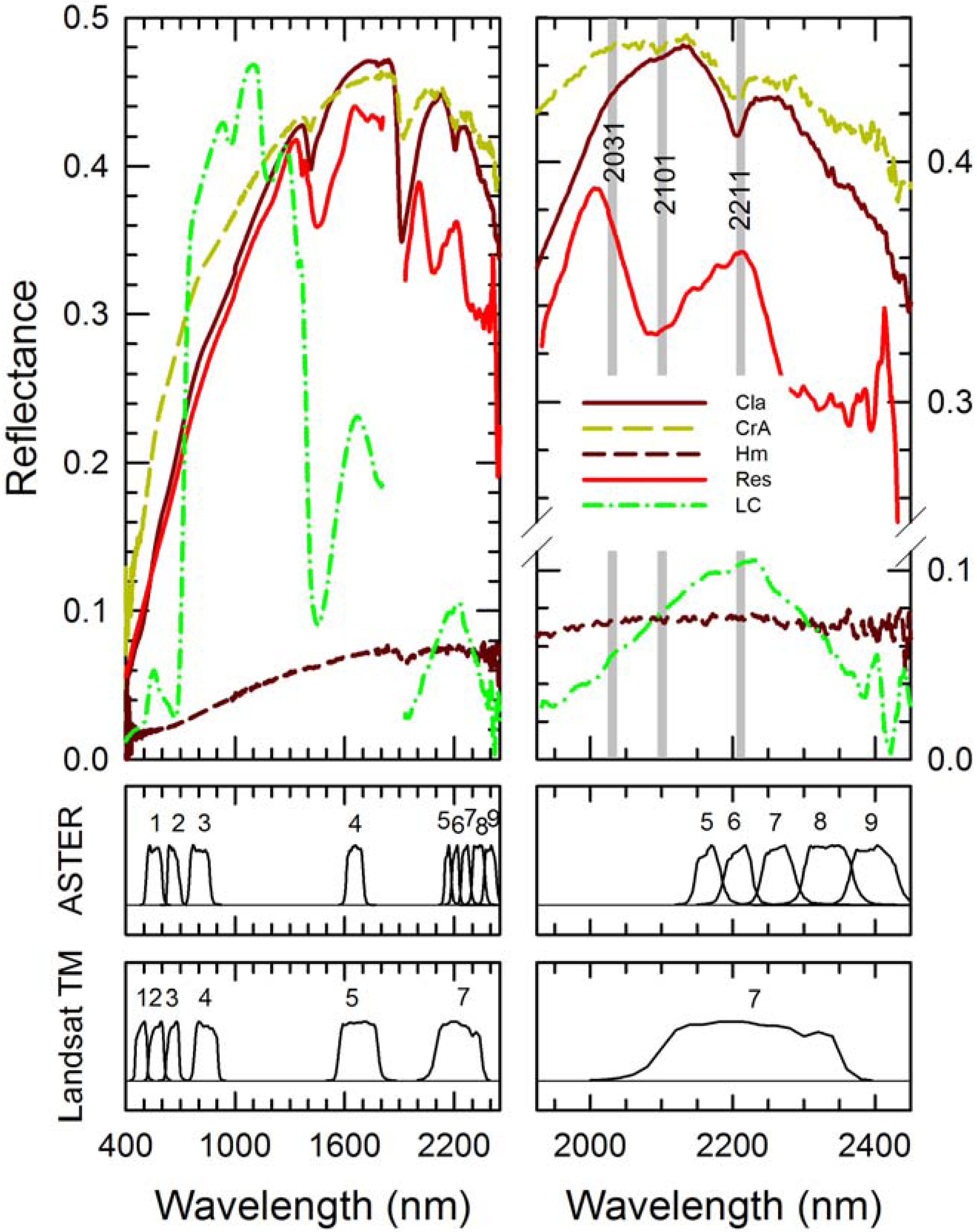 where R denotes reflectance and the subscripts denote 11 nm-wide bands centered at 2,031, 2,101, and 2,211 nm wavelength. CAI essentially measures the depth or intensity of the 2,101 nm absorption [40,41] as shown in Figure 2. R2031 is determined at 2,031 nm wavelength and not 2,000 nm in order to avoid a narrow atmospheric CO2 absorption feature centered at 2,010 nm [39,44].