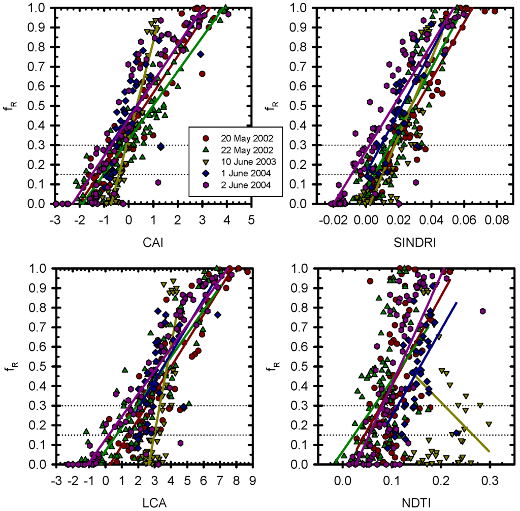 Comparison of crop residue cover (fR) and fR index values with regression lines for the Beltsville, MD data sets [30]. Index acronyms: CAI–Cellulose Absorption Index; SINDRI–Shortwave Infrared Normalized Difference Residue Index; LCA–Lignin-Cellulose Absorption Index; and NDTI–Normalized Difference Tillage Index. Straight lines denote regression lines. Dotted lines denote tillage class boundaries. Data were acquired with an ASD Inc. Fieldspec Pro FR spectroradiometer (Boulder, CO).