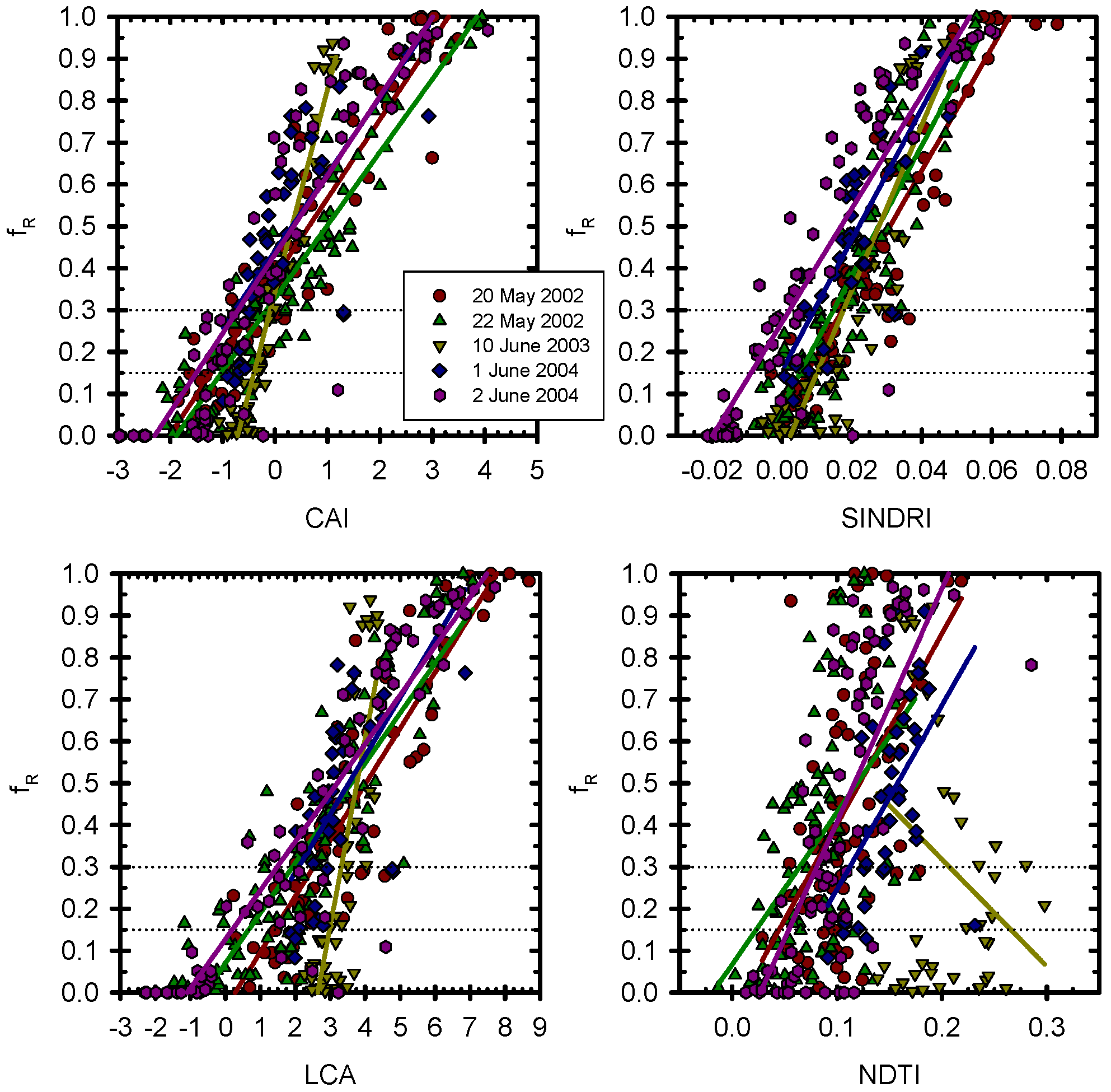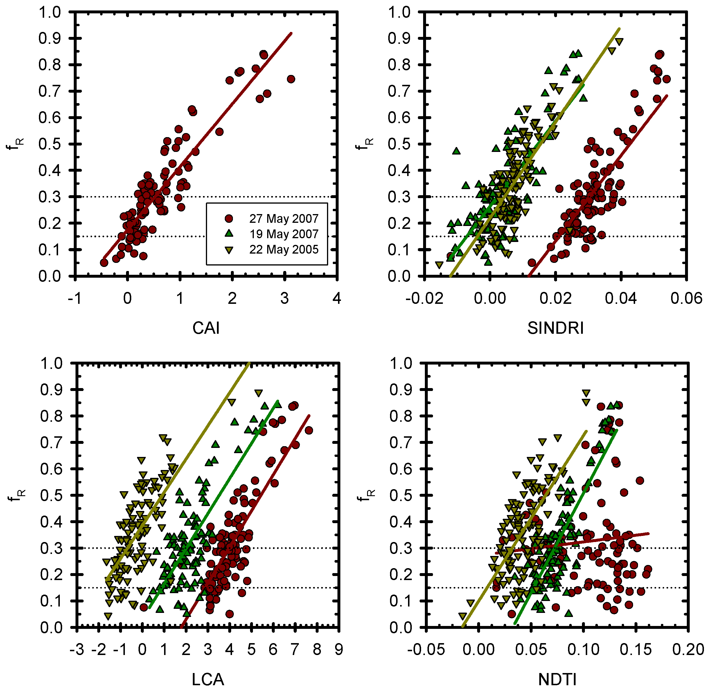 Comparison of crop residue cover (fR) and fR index values with regression lines for the Ames, IA area. Index acronyms: CAI–Cellulose Absorption Index; SINDRI–Shortwave Infrared Normalized Difference Residue Index; LCA–Lignin-Cellulose Absorption Index; and NDTI–Normalized Difference Tillage Index. Straight lines denote regression lines. Dotted lines denote tillage class boundaries. 22 May 2005 and 19 May 2007 multispectral data were acquired by the ASTER sensor. 27 May 2007 hyperspectral data were acquired from aircraft by SpecTIR LLC (Sparks, NV). CAI is only available for 27 May 2007 imagery.