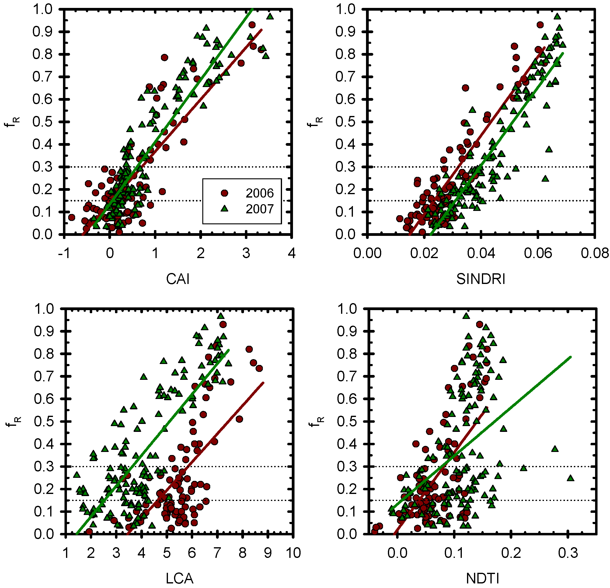 Comparison of crop residue cover (fR) and fR index values with regression lines for Fulton, IN, 29 May 2006. Index acronyms: CAI – Cellulose Absorption Index; SINDRI–Shortwave Infrared Normalized Difference Residue Index; LCA–Lignin-Cellulose Absorption Index; and NDTI–Normalized Difference Tillage Index. Straight lines denote regression lines. Dotted lines denote tillage class boundaries. Data were acquired from aircraft by SpecTIR LLC (Sparks, NV).
