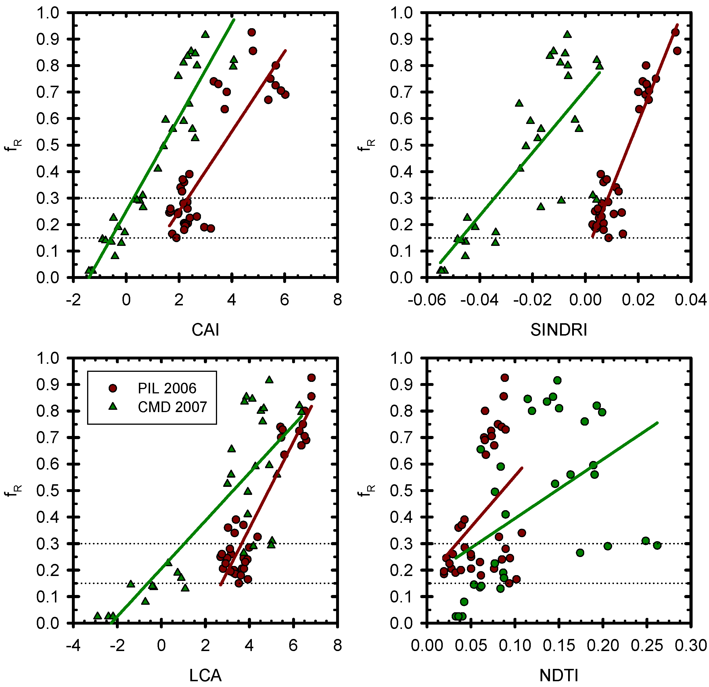 Comparison of crop residue cover (fR) and fR index values with regression lines for the Pesotum, IL (PIL) and Centreville, MD (CMD) areas. Index acronyms: CAI–Cellulose Absorption Index; SINDRI–Shortwave Infrared Normalized Difference Residue Index; LCA–Lignin-Cellulose Absorption Index; and NDTI–Normalized Difference Tillage Index. Straight lines denote regression lines. Dotted lines denote tillage class boundaries. Data were acquired from aircraft by SpecTIR LLC (Sparks, NV).