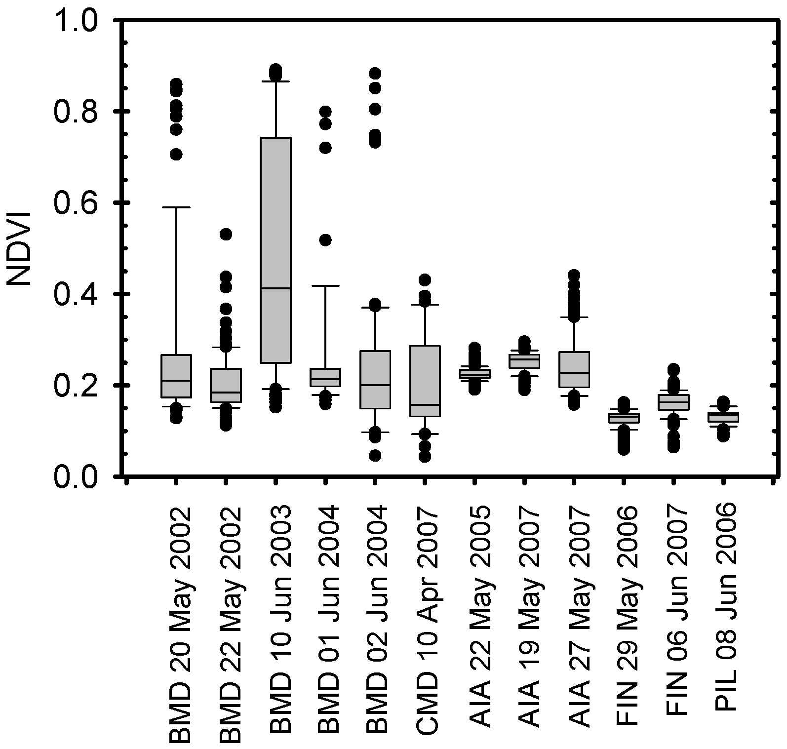 Range of ASTER derived NDVI values for each data set. BMD, CMD, AIA, FIN, and PIL denote data from the Beltsville, MD, Centreville, MD, Ames, IA, Fulton, IN, and Pesotum, IL sites, respectively. Black dots denote outlier values above the 10th and below and the 90th percentile values (whiskers), the box denotes values between the 25th and 75th percentiles, with the median values being the bars in the middle of the boxes.