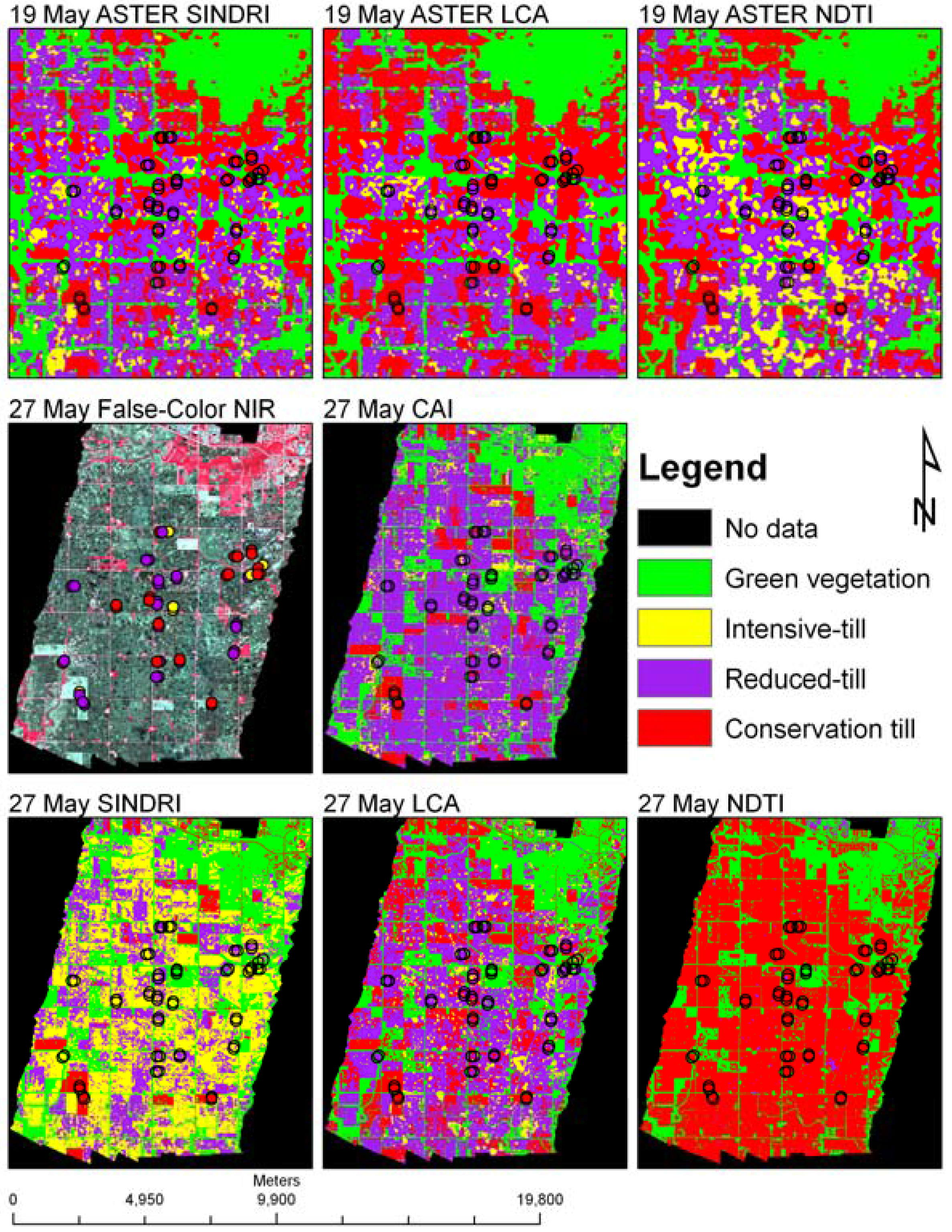 Comparison of crop residue indices and classification results for the area southwest of Ames, IA. The top three images were calculated from 19 May 2007 multispectral ASTER imagery; the bottom five are derived from airborne hyperspectral imagery acquired by SpecTIR LLC (Sparks, NV) on 27 May 2007. 27 May SINDRI, LCA, and NDTI were calculated from convolved equivalent ASTER and Landsat TM bands. Circles denote ground-truth locations. Color-coded circles in the 27 May 2007 false-color NIR image denote ground truth tillage classes.
