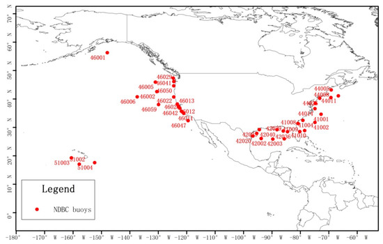 The National Data Buoy Center (NDBC) [31] provides average hourly wind vector measurements recorded at 39 buoys around North America (shown in Figure 1). These NDBC buoys are commonly operated and maintained by American government organizations to report on winds, waves and other ocean conditions at strategic locations for the purposes of ocean navigation, search and rescue operations, and scientific research. The 39 buoy measurements were selected as validation data and they provide a longer time series of meteorological observations relative to QuikSCAT, WindSAT and ASCAT data from 1999 to 2015. These NDBC buoys provided hourly wind vector measurements at a height of 4 or 5 m above sea level. The wind profile method (in Section 3.1) has been used in this study to extrapolate wind speed to heights of 10 m and 100 m above sea level in order to compare with satellite data at the same height. The distances from buoys to coastline are greater than 30 km, and the water depths of the buoys’ positions range from 16 m to 5230 m. There are 32 buoys at water depths greater than 50 m so a large amount of the buoys may not be influenced by coastal effects.