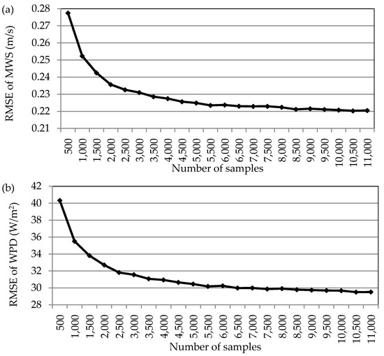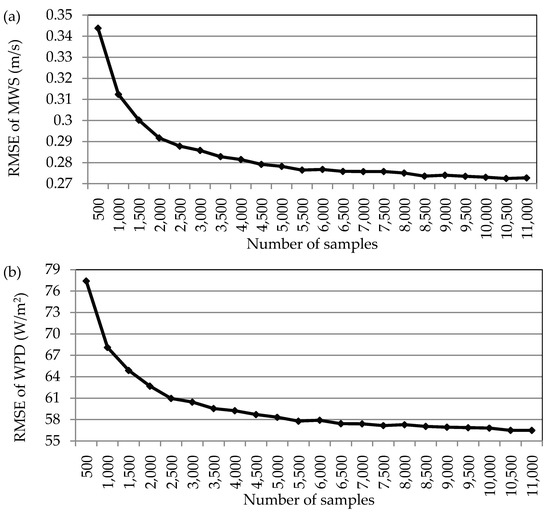 In order to verify the impact of data sampling density (random sampling numbers of satellite observations) on the accuracy of satellite-derived MWS and WPD at 10 m and 100 m above sea level, we acquired 100 MWS/WPD random samples (500, 1000, 1500, …, 11,000) from all satellite observations (QuikSCAT + WindSAT + ASCAT) by sampling 100 times repeatedly. The 100 satellite-derived MWS/WPD samples were compared with the buoy-derived MWS/WPD at each buoy position (39 NDBC buoy in total) and at different sampling densities using RMSE. Figure 2 and Figure 3 illustrate the variation of mean RMSE as a function of sampling density at 10 m and 100 m above sea level. The result shows that more satellite observations may reduce the uncertainty in MWS and WPD estimation at 10 m and 100 m above sea level. This result is consistent with the research results of Barthelmie, Pryor and Hasager [17,36].