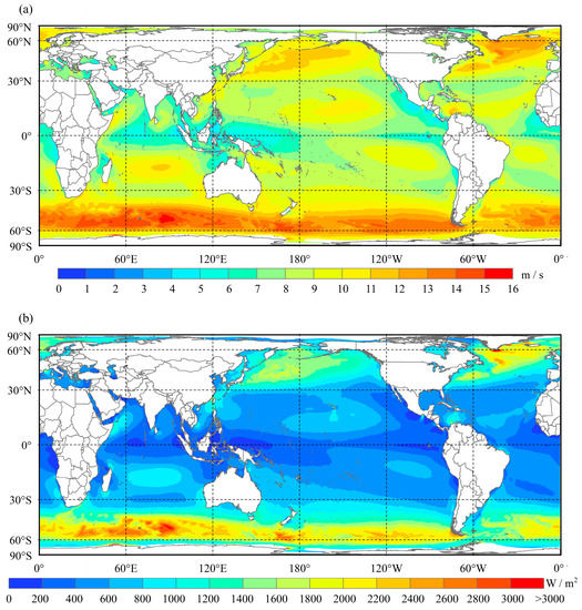 The distribution of global MWS and WPD at 10 m above sea level derived from QuikSCAT+ WindSAT + ASCAT during the period 1999–2015. (a) MWS, and (b) WPD.