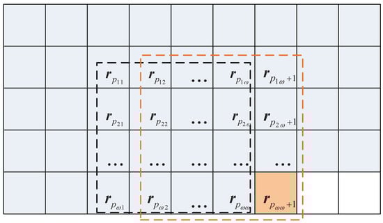 Figure 3 illustrates two continually sliding windows with size of depicted by black dashed lines and orange dashed lines, respectively, where denotes the most recent received data sample vector. The sample data vectors update process in sliding windows can be implemented in steps by removing one pixel and adding one pixel each step. Suppose that , the inverses of correlation matrices of the local window at and are denoted as and respectively, and inverses of the covariance matrices of the local window at and are denoted as and , respectively. In analogy with (7), (8), (10), and (11), can be updated recursively as follows.