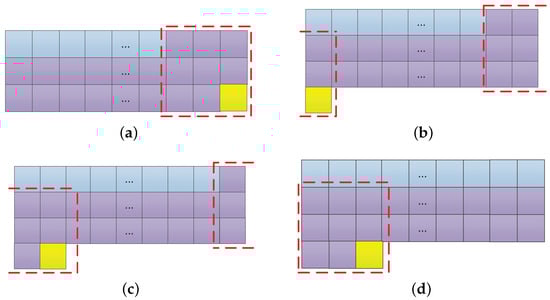 The first issue is the edge expansion. To ensure that there is no absence of detection on the edge of an image, the edge expansion is usually operated as a preprocessing for a local window detector. Due to the low probability of anomaly targets appearance in hyperspectral images, enplaned layers can be randomly chosen from the whole image []. With this consideration in mind, take the window with size of as an example. We design the sliding window strategy, depicted in Figure 4, where the yellow, blue and purple grids, respectively, denote the latest pixel received, the processed data and the pixels to be processed. As Figure 4 shows, when the sliding window meets the right board of the hyperspectral image, the next several sliding windows are across the border by moving down one line and adding new data one by one. The last sliding window moves to the right-bottom until the last sample data is received. This design enables the recursive processing of LS-RXD more conveniently.