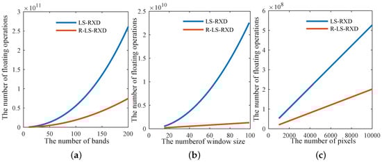 Table 2 tabulates the number of floating operations (flops) required for LS-RXD and R-LS-RXD, which update in different method, where the bands number is specified by L, local window size is specified by , and the pixels number to be processed is specified by N. These parameters determine the number of flops in the algorithm. Figure 5 plots the number of floating operations required for every algorithm versus L, a and N. The configurations of parameters are shown in Table 3.