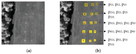 The second image data set is the Hyperspectral Digital Imagery Collection Experiment (HYDICE) image scene shown in Figure 7a which was collected in August 1995 from a flight altitude of 10,000 ft with the ground sampling distance approximately 1.56 m. This scene has been studied extensively by many reports such as [,]. It has a total of 169 bands which were used for the experiments with low signal/high noise bands: bands 1–3 and bands 202–210; and water vapor absorption bands: bands 101–112 and bands 137–153, removed. There are 15 panels with three different sizes of , and . Figure 7b shows the precise spatial locations of these 15 panels, where red pixels (R pixels) are the panel center pixels and the pixels in yellow (Y pixels) are panel boundary pixels mixed with the background (BKG) . As a result, there are a total of 19 R panel pixels. In particular, R panel pixels are denoted by with rows indexed by and columns indexed by except that the panels in the 1st column with the 2nd , 3rd , 4th, 5th rows which are two-pixel panels, denoted by , , , , , , , . The 1.56 m-spatial resolution of the image scene suggests that most of the 15 panels are one pixel in size.