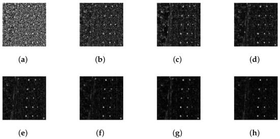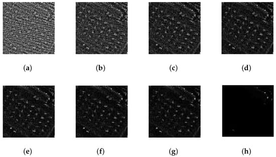 Detection abundance fractional maps of AVIRIS by recursive local summation RXD (R-LS-RXD) with different sliding window size: (a) = 5; (b) = 7; (c) = 9; (d) = 11; (e) = 13; (f) = 15; (g) = 17; (h) global.
