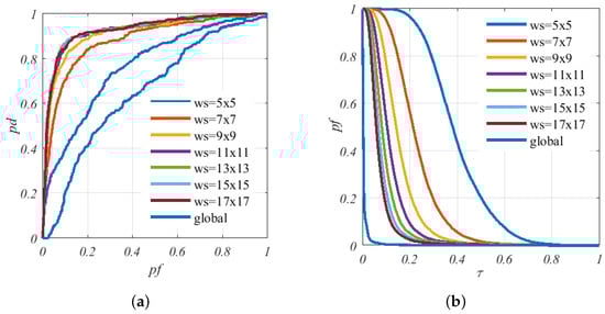 In order for a further quantitative evaluation of detection performance with different window sizes, the ROC curves are implemented. To simplify our study, ROC curves for HYDICE data are not given, since the results are similar for both data sources. Figure 10 shows the ROC curves for AVIRIS data with different window sizes, with a traditional (, ) ROC in (a) and a (, ) curve analysis in (b), respectively. Additionally, the AUC values, denoted by , are calculated for each (, ) curves and (, ) curves. In general, the higher the value of and the lower the value of , the better the detection performance is. Results are tableted in Table 4, with the best results highlighted.