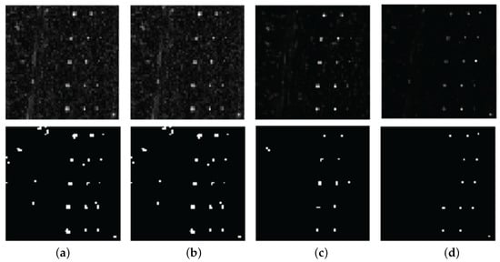 Detection results of the four detectors using AVIRIS and HYDICE data are shown in Figure 11 and Figure 12, respectively. The first line shows the gray scale results with detected abundance fractions, and the second line demonstrates the binary detection maps separated in an appropriate threshold, which was calculated by Otsu algorithm [].