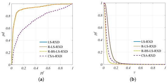 ROC analysis with different detectors: (a) curve of (, ); (b) curve of (, ).