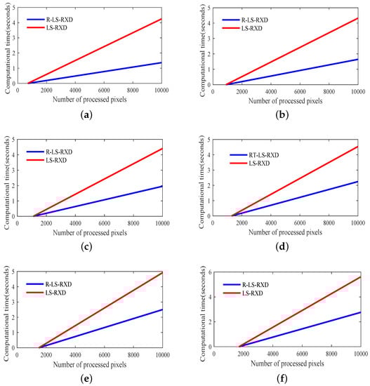 To further evaluate computational complexity, Figure 14 plots the computing time versus the number of processed pixels for both R-LS-RXD and LS-RXD on the Sandiego hyperspectral image. Each algorithm was run and executed five times to produce an average computing time. As we can see, R-LS-RXD requires less time than LS-RXD does due to the fact that the former implements a recursive process, while the latter implements a nonrecursive process. As also shown in the figure, the computing time increases linearly as new pixels are added.