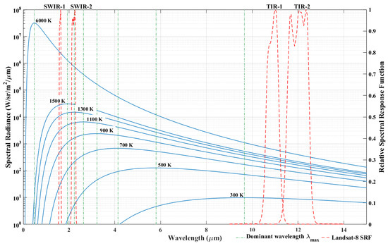 Blackbody radiation curves at different blackbody temperatures, as derived from Plank’s law, and relative spectral response functions of the Landsat-8 operational land imager (OLI) and thermal infrared sensor (TIRS).