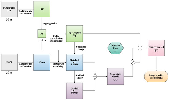 Thermal data is related to emissivity of objects on the ground, and this property can account for biophysical phenomena [1,2]. Recently, thermal remote sensing based on satellite sensors has made it possible to establish temperature maps over wide areas. However, a trade-off exists between spatial and spectral resolutions in any spaceborne remote sensing system [3,4]. This limitation appears especially in thermal infrared (TIR) sensors. For instance, TIR sensors in the Landsat-8 platform obtain the radiation emitted by the earth in a range of 10–13 μm, but the TIR band retrieves lower total radiation than visible-near infrared (VNIR) and shortwave infrared (SWIR) bands. Due to this radiometric characteristic of the TIR sensor, the spatial resolution of the TIR band is coarser than that of other bands. In addition, the limited spatial resolution of TIR sensors emphasizes the necessity for disaggregation of TIR imagery, also called thermal sharpening or downscaling, in order to improve the spatial resolution of the thermal data products [5]. The purpose of TIR disaggregation is to sharpen the coarser spatial resolution of TIR images by introducing spatial detail from a finer resolution multispectral (MS) image, without distortion of spectral information.