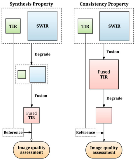 There are two validation methods that are commonly used to assess the quality of the fused image. The first is the synthesis property, and the other is the consistency property as shown in Figure 3. First, the synthesis property considers that the disaggregated image should be as close to identical to the acquired input image as possible. However, at the full-resolution scale, assessment of the synthesis property is not possible, thus the fusion images, SWIR and TIR, were degraded by the scale ratio between the pixel sizes of the SWIR image and the BT image. The degraded images were used as an input of the disaggregation method, and the degraded fused image was compared to the original observed BT image as a reference. Second, the consistency property reflects the degree to which the spatially degraded fused image is identical to the original observed BT image. Cubic convolution interpolation was applied for image degradation of the synthesis and consistency properties. To validate the evaluation process, both synthesis and the consistency properties were applied to our experimental assessments.