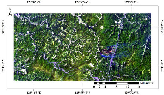 On 6 May 2017, a series of wildfires that destroyed more than thirty homes and caused the evacuation of 2500 residents occurred simultaneously in Samcheok, Gangneung and Sangju, cities in South Korea. Together, these fires burned nearly 150 ha. Especially dry climate conditions in spring promoted the rapid growth of the wildfires. The study area is located in Samcheok city, Gangwon province, one of the areas affected by the spring 2017 fires (Figure 4). For the proposed thermal disaggregation and comparative processes, freely accessible Landsat-8 Level-1 OLI and TIRS datasets, with a spatial resolution of 30 m in the VNIR and SWIR bands and 30 m in the TIR bands (originally, 100 m), were acquired from the USGS Earth Explorer website [57]. The datasets were acquired at 01:58:02 GMT (10:58:02 local time), May 8th, 2017 from the 114 path and 34 row in the world reference system-2 (WRS-2). The acquisition datasets were clipped including the wildfires and marginal cloud-free areas, and the size of the TIR images was 267 × 543 pixels, and that of the MS images was 801 × 1629 pixels. Considering the two-day gap between the initiated wildfire and the image acquisition date, the datasets are expected to include a variety of wildfire components, for example, flaming combustion, smoldering combustion, and burned areas. In particular, flaming combustion, a core of wildfires, is remarkably shown in the acquired imagery (refer to Figure 4).