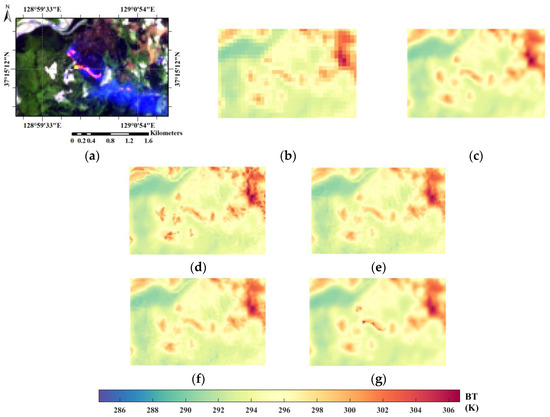 Disaggregated brightness temperature results at subset B: (a) SWIR2-SWIR1-Blue composite image; (b) Original BT image; (c) Distributed BT image; (d) DisTrad method; (e) TsHARP method; (f) LMS method; (g) Proposed GF method.