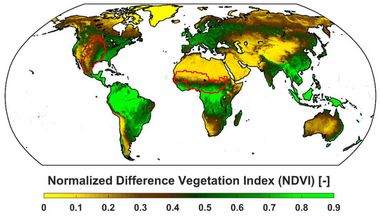 As an indicator for the vegetation, the Normalized Difference Vegetation Index (NDVI) derived from observations by the Moderate Resolution Imaging Spectroradiometer (MODIS) was used. Figure 1 shows the global map of NDVI, including the two hotspots, as used in step 4 of the evaluation. MODIS is an instrument on board the Terra and Aqua satellites, and acquires data in 36 spectral bands, ranging from 0.4 µm to 14.4 µm. The NDVI uses infrared and visible observations that are linked to vegetation greenness, which is an indirect measurement for living vegetation and plant chlorophyll content. From MODIS, the monthly NDVI product (MODC13C2/Terra) over the period of 2012 to 2015 was downloaded, from which the overall average was taken. The original data was projected on a 0.05° grid, which was further aggregated into a global 0.25° grid to match the remotely sensed soil moisture products.