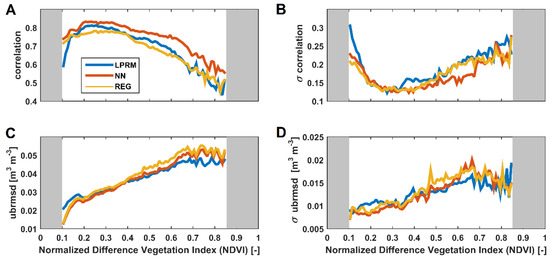 A glance at Figure 2C, which shows the ubrmsd between the AMSR-E and SMOS soil moisture products, reveals a slightly different outcome than the temporal correlation coefficients. Here, the variation of the ubrmsd over different vegetation regimes is quite similar for all three approaches. NN and REG have the lowest ubrmsd up to an NDVI of 0.2. Then all three approaches have similar ubrmsd for the NDVI range between 0.2 and 0.4. Over the more densely vegetation areas (NDVI > 0.4), LPRM and NN give the lowest ubrmsd. Differences however are very small, with an ubrmsd between 0.02 and 0.04 m3 m−3 for NDVI values below 0.6. The σ of the ubrmsd, as seen in Figure 2D, reveals a similar behavior as for the mean ubrmsd, it steadily increases with denser vegetation up to an NDVI of 0.65, with values ranging between 0.005 and 0.020.
