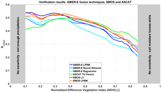 The currently available satellite-based soil moisture datasets, based on both passive (e.g., AMSR-E and SMOS) and active microwave observations (e.g., ASCAT), are able to provide a valuable source of information over a wide range of vegetation regimes when combined in an optimal way. The contribution of L-band-based soil moisture retrievals can mainly be found over moderate vegetated areas, but future studies could focus on increasing the spatial consistency in soil moisture records by using L-band measurements for scaling purposes, as it has a stable performance over a broad range of NDVI values. Secondly, as the NN approach showed the highest skill in the comparison, the possibility of using this approach to improve the consistency in long-term soil moisture records can be further investigated. In order to improve consistency, this should be combined with more advanced merging strategies that use multiple satellites and retrieval methods, as this study shows that no single sensor or retrieval algorithm outperforms all the others.