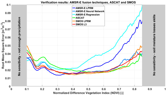 AMSR-E-based soil moisture is again performing better over the more sparsely vegetated areas than SMOS. Al-Yaari et al. [64] also found this difference but the reason for it is still unknown. It might be due to the difference of the radiometric accuracy of AMSR-E (<1 K) versus the radiometric accuracy of SMOS (2–4 K), which could play a role over regions where vegetation attenuation has a smaller impact than the direct signal to noise ratio performance. Another plausible solution might be related to the complexity to estimate the effective temperature, Parinussa et al. [36] showed that in (semi-)arid climate regions effective temperature derived from simultaneous Ka-band observations specifically adds information compared to extracting this effective temperature input from reanalysis models, which is currently being done for both SMOS soil moisture products. Thirdly, the different sampling depth of L-band as compared to C-band, especially in (semi-)arid conditions, could lead to more complex dielectric roughness effects, which are challenging to include in the models. The use of L-band does show a solid performance over the complete NDVI range and could contribute to a multi-sensor approach throughout. From a historical point of view it is also important to note that a combination of AMSR-E and ASCAT are also able to provide such a high-quality dataset (e.g., as is implemented within the ESA-CCI-SM). Concerning the different data fusion approaches, the message is similar to that of the Rvalue evaluation. The two SMOS datasets have a comparable rmse throughout the different vegetation regimes, while for the AMSR-E datasets there is a clear difference between areas with lower NDVI where LPRM has the lowest error, and higher NDVI values where NN has the lowest error. REG shows reasonable rmse over sparsely vegetated areas but is unable to cope with denser vegetation conditions.