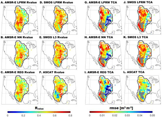 For the central Great Plains all datasets mainly reach Rvalue values between 0.4 and 0.7. The two SMOS datasets have comparable values and patterns, with the Rvalue hardly dropping below 0.5 and showing the highest overall values. The AMSR-E datasets do show a slight drop in skill over the Eastern areas to values of 0.4, where the vegetation density increases, but reach the highest values in the western part. When comparing the three AMSR-E sets, very similar patterns can be found, with AMSR-E LPRM giving the highest values, followed by AMSR-E REG and AMSR-E NN. ASCAT is showing high values in the central part of the Great Plains but its performance significantly drops in the Chihuahuan Desert, which is characterized by extremely arid conditions. The TCA results over the central Great Plains are shown in Figure 6G–L. Here, both the SMOS datasets show the lowest overall rmse values around 0.01 m3 m−3 for the non-forested regions in the west and around 0.025 m3 m−3 over the forested regions in the east. The influence of the vegetation change on rmse can be seen in both AMSR-E and SMOS datasets, with AMSR-E significantly increasing to values over 0.04 m3 m−3 in the forested areas. Between the AMSR-E datasets, the AMSR-E NN dataset has the lowest overall rmse, followed by AMSR-E LPRM and to a lesser extent AMSR-E REG. ASCAT demonstrates rmse values between 0.02 and 0.03 m3 m−3, slightly lower to the west and higher to the east. For the TCA, results were masked over the Chihuahuan Desert (Figure 6G–L), as the TCA as it does not meet the standard TCA requirements over that area [38].